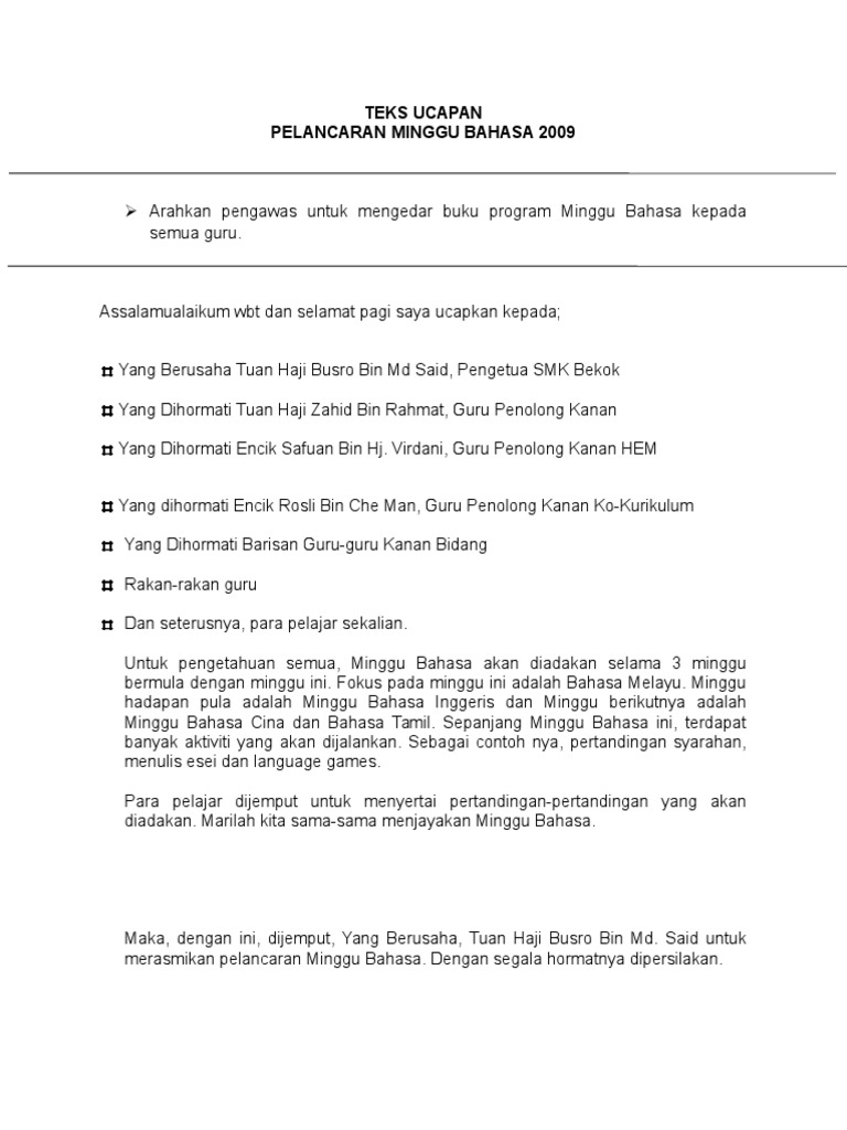 Minit mesyuarat Bil12014 diterima sebulat suara daripada semua ahli tanpa sebarang pindaan. Ucapan atau syarahan biasanya disampaikan dalam sesuatu majlis. Sekolah anda telah menjayakan Program Minggu Bahasa Melayu anjuran Panitia dan Persatuan Bahasa Melayu.